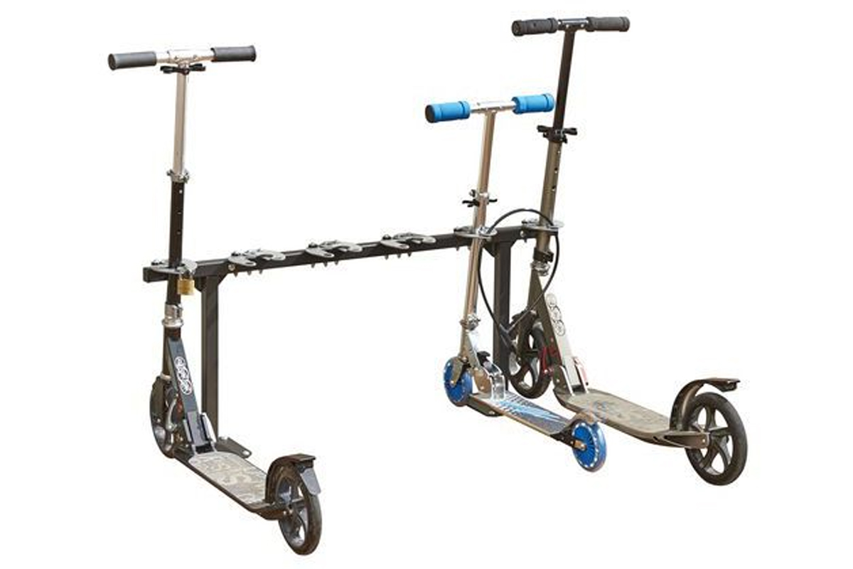 Ranges-trottinettes avec système antivol. Fermeture par cadenas (U) ou câble. Fixation au sol ou mural.